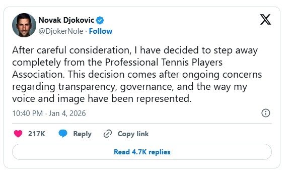 "Решението взех след продължителни опасения относно прозрачността, начина на управление и начина, по който се представят моят глас и имидж. Гордея се с визията, която Вашек и аз имахме, когато основахме PTPA – да дадем на играчите по-силен и независим глас – но стана ясно, че моите ценности и подход вече не съвпадат с посоката, в която се развива организацията", написа той в Х.
