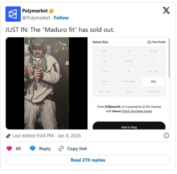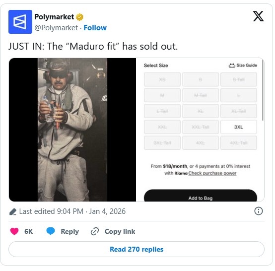 Въпреки че не е ясно дали Мадуро е бил заловен с анцуга или му е бил даден от американските сили, той предизвика почти пълната разпродажба на цветовата гама на уебсайта на американския Nike в рамките на часове след публикуването на снимката, установи Polymarket.