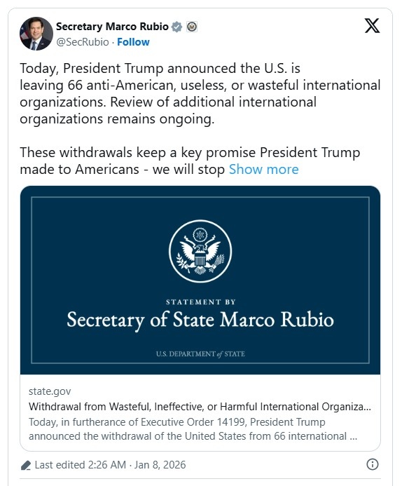 „Администрацията на Тръмп установи, че тези институции се дублират по обхват, управляват се лошо, ненужни са, разхищават средства, функционират неефективно, попаднали са под влиянието на хора, които прокарват свой дневен ред в противоречие с нашия. Или пък представляват заплаха за суверенитета, свободите и общото благоденствие на нашата страна“, се казва в изявление на държавния секретар Марко Рубио.