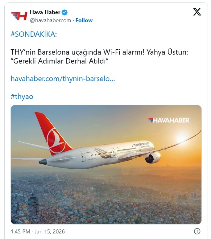 От публикацията на Юстюн в Екс (X) става ясно, че когато полет ТК1853 е приближил летището в Барселона, един от пътниците е променил името на Wi-Fi мрежата на самолета така, че то да съдържа бомбена заплаха. По думите на Юстюн след безопасното приземяване на самолета испанските власти са започнали съответните проверки съгласно международните разпоредби за авиационна безопасност.