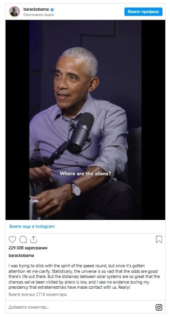 В неделя вечерта Обама публикува в Instagram изявление, в което изясни какво е имал предвид с коментарите си. „Опитах се да се придържам към духа на бързата поредица въпроси, но тъй като тя привлече внимание, нека да поясня. Статистически погледнато, Вселената е толкова огромна, че вероятността да има живот там е голяма. Разстоянията между планетарните системи (като Слънчевата) обаче са толкова големи, че шансовете да сме били посетени от извънземни са малки, а по време на президентството си не съм видял никакви доказателства, че извънземни са влизали в контакт с нас. Наистина!“, отбеляза президентът на САЩ (2009-2017).