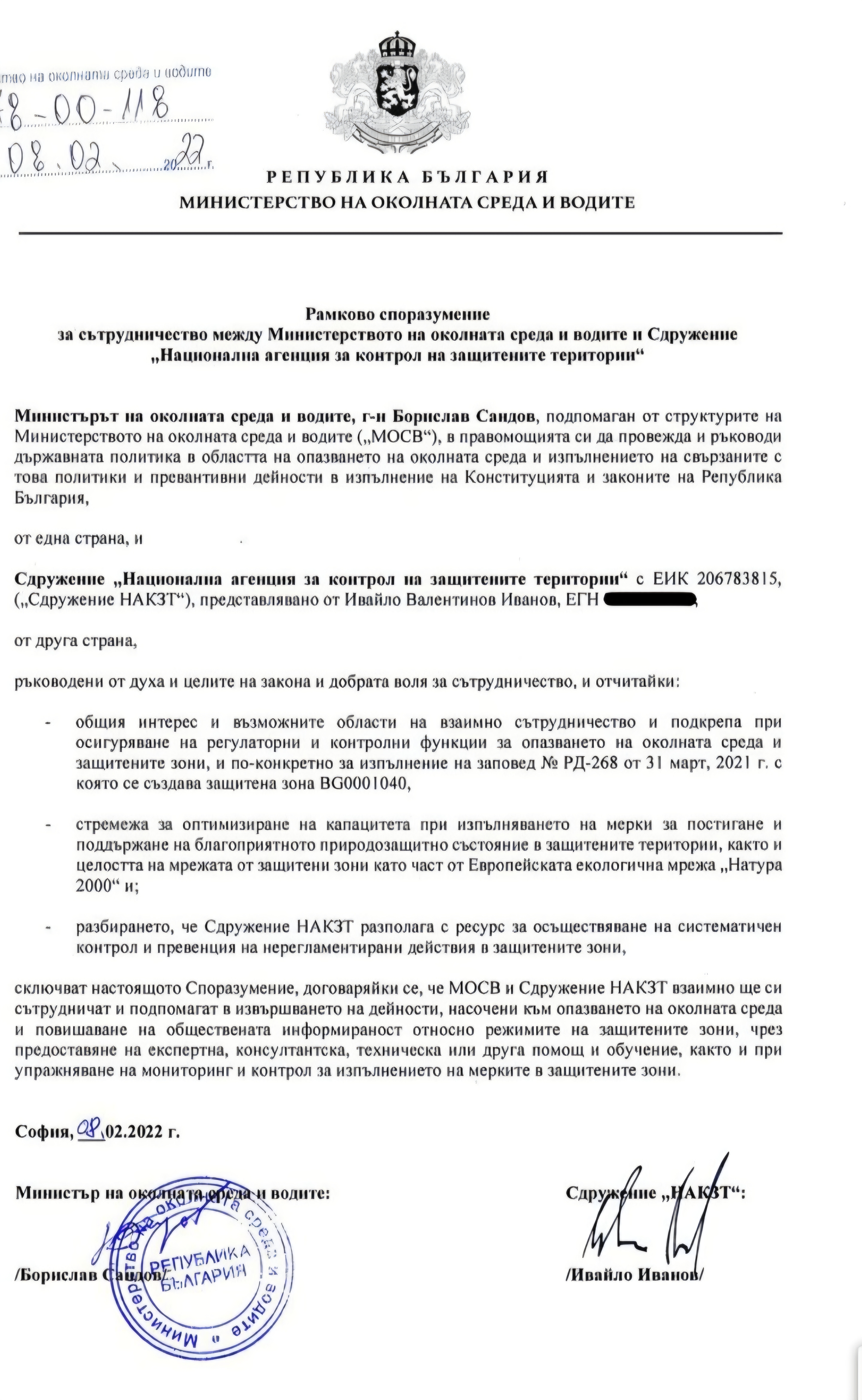 Това е в следствие и като продължение на рамковото споразумение, подписано от Борислав Сандов с Националната агенция за контрол на защитените територии на Ивайло Калушев.