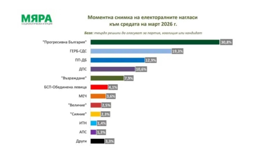 Изследването е проведено „лице в лице“ с таблети между 7и 16 март 2026 г. сред 809 пълнолетни български граждани. Максималната стандартна грешка е ±3,5 при 50% дялове. 1% от цялата извадка (а не от гласуващите) се равнява на близо54 000 души. Изследването е възложено, проведено и финансирано от агенция „Мяра“.