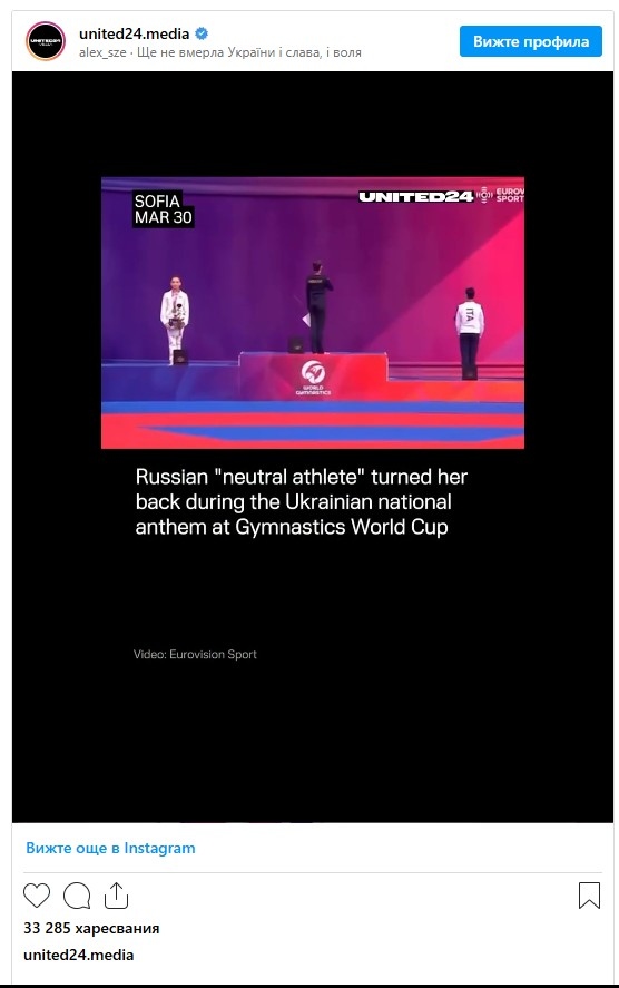 Една от тях - София Илтерякова, шокира зрителите по време на награждаването след финала на обръч. Тя демонстративно загърби флаговете, докато от уредбата звучеше украинския химн в чест на шампионката Таисия Онофрийчук. Самата Илтерякова остана втора, пише btvsport.bg.