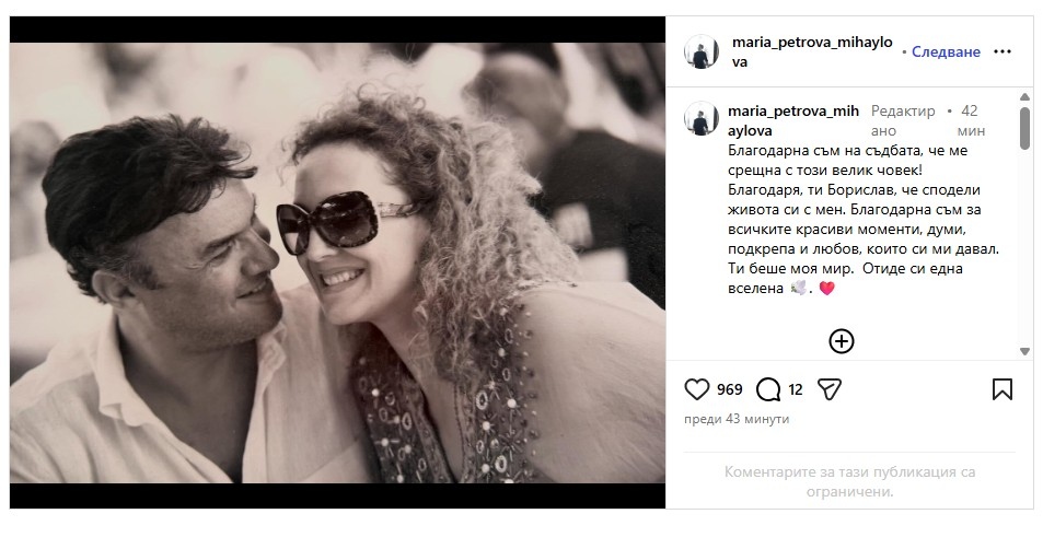 Съпругата на Борислав Михайлов – Мария Петрова, написа прощално обръщение към покойния си мъж. Тя изрази скръбта си с пост в Instagram.