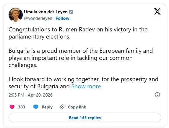 "България е горд член на европейското семейство и игре важна роля в справянето с предизвикателствата пред нас. Нямам търпение да работим заедно за просперитета и сигурността на България и Европа", написа в Х Фон дер Лайен.
