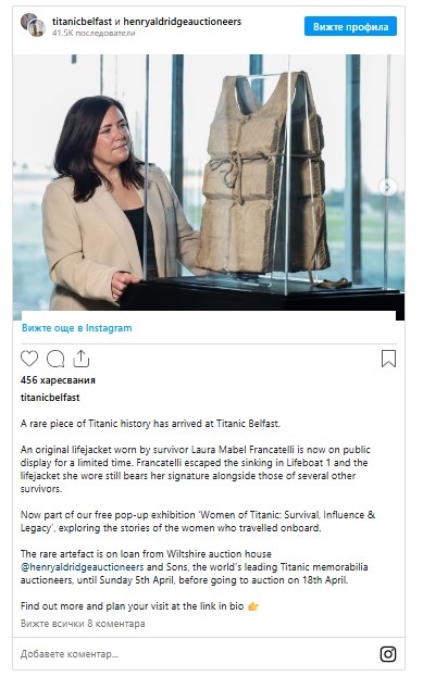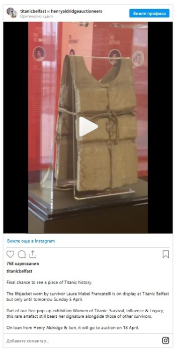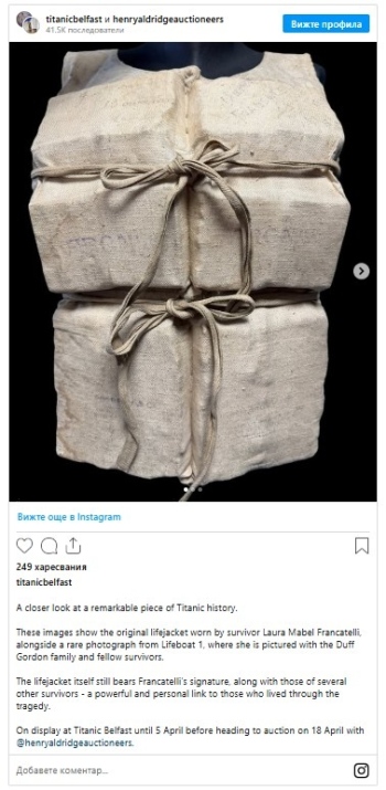 Жилетката беше сред предметите, включени на търг със сувенири от „Титаник“, организиран от аукционната къща „Хенри Олдридж и син” в Девайз, Западна Англия. Новият ѝ притежател е участник, включил се в търга по телефона. Самоличността му не е съобщена. Предварителната оценка на спасителната жилетка беше между 338 000 и 473 000 щатски долара (250 000 и 350 000 британски лири), предава БТА.
