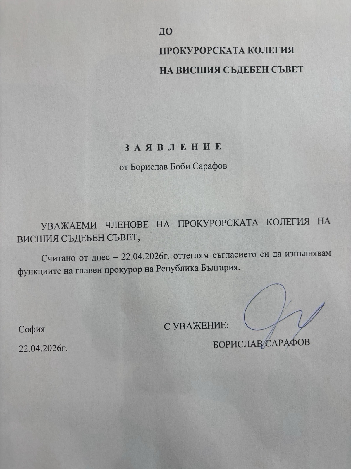 Заявлението с дата 22 април 2026 година бе получено на пощата на "24 часа" неофициално. Редакцията потърси Борислав Сарафов за коментар, но до този момент няма връзка с него. Двама членове на прокурорската колегия обаче потвърдиха неофициално, че това решение колегата им е взел още преди изборите. И те не били изненадани от заявлението заради доста неформални разговори.