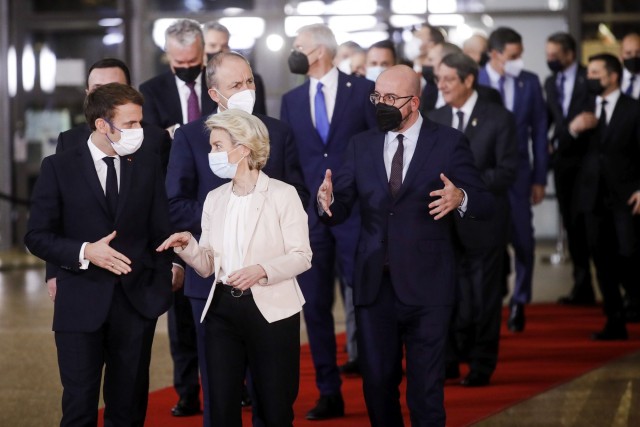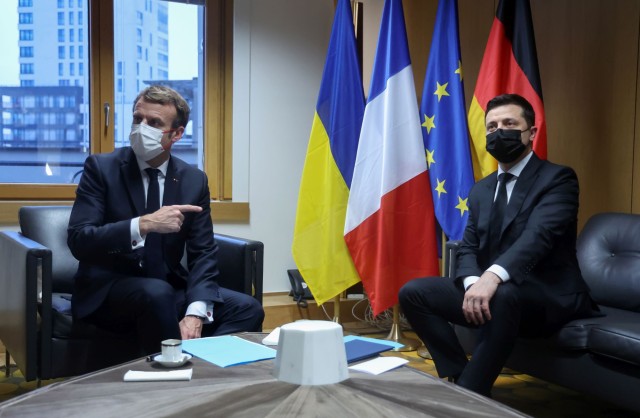 Френският президент Еманюел Макрон, германският канцлер Олаф Шолц и украинският президент Володимир Зеленски са разговаряли в кулоарите на срещата на върха на Източното партньорство на ЕС в Брюксел, за да потърсят начин за рестартиране на преговорите по линия на "нормандската четворка", която включва освен техните страни и Русия.