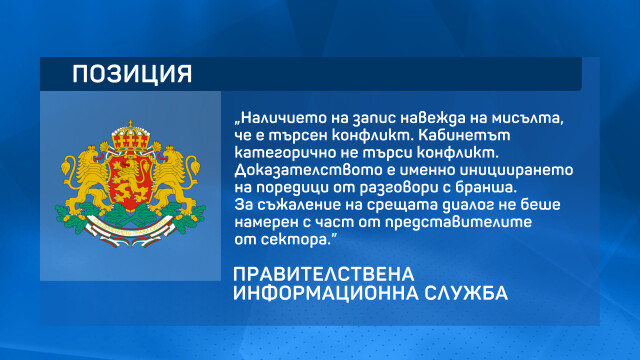 „Наличието на запис навежда на мисълта, че е търсен конфликт. Кабинетът категорично не търси конфликт. Доказателството е именно инициирането на поредици от разговори с бранша. За съжаление, на срещата диалог не беше намерен с част от представителите от сектора“, се казва в съобщение на МС.